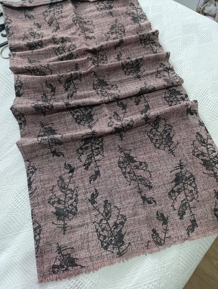 Kadınlar için dantel detaylı, koyu yaprak desenli bej renkli, rahat ve bohem tarzda tekstil şal. Hipi ve retro esintili görünüm sunar.