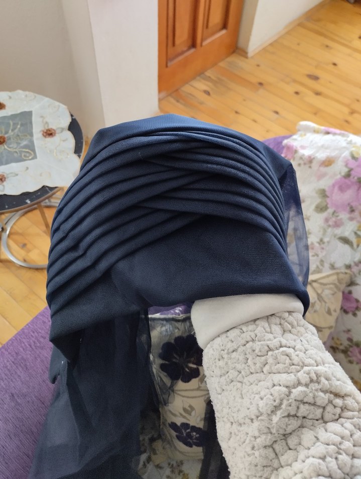 Kadınlar için lacivert renkte, sentetik kumaştan drapeli bohem tarzda şal. Avant-garde esintisi taşır. lacivert eşarp modeli hazır duvak