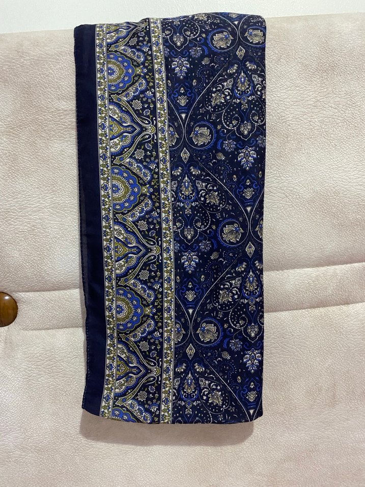 Kadınlar için koyu lacivert renkte, bohem desenli ve drapeli tasarıma sahip sentetik kumaştan yapılmış şal. Retro ve hippie tarzına uygundur.