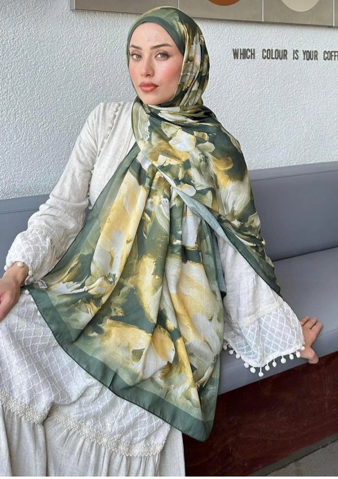 Kadınlar için drapeli, açık haki renginde ve saten dokulu bohem tarzda bir şal.