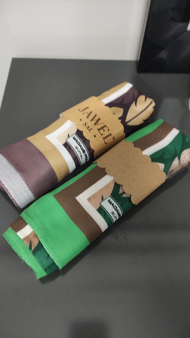 Bohem tarzda, ipek dokulu, esnek özellikli şallar. Koyu haki tonlarında, üzerinde 'JAW' yazısı bulunan etiketle. Rahat ve retro görünüme uygundur.