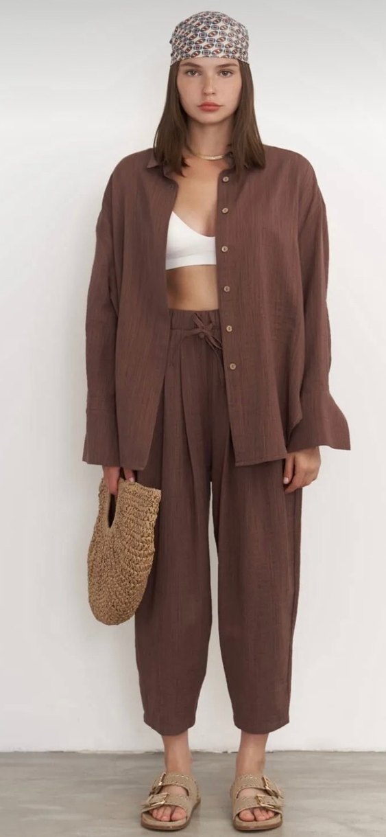 Kadınlar için bol kesim, uzun boy, kahverengi keten pantolon. Minimalist ve bohem stil ile günlük kullanım için rahat ve şık bir seçim.
