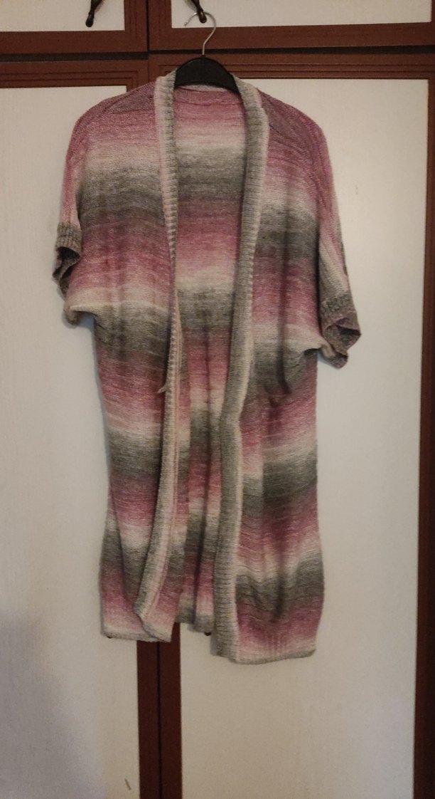 Gri ve çok renkli örgü batik desenli, kısa kollu, salaş kesim kadın hırka. Midi boy, bohem tarzda günlük kullanım için uygundur. M /L uyumlu