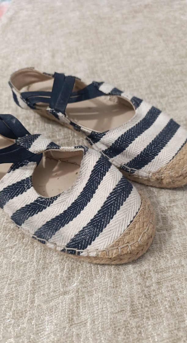 espadriller, mavi ve gri zebra desenli yumuşak sentetik kumaştan yapılmıştır. Tokalı kayışı ve bohem tarzı vardır, gündelik şıklık için uygundur. iki kere giydim. hamilelik sebepli satıyorum hiç deformesi yoktur.