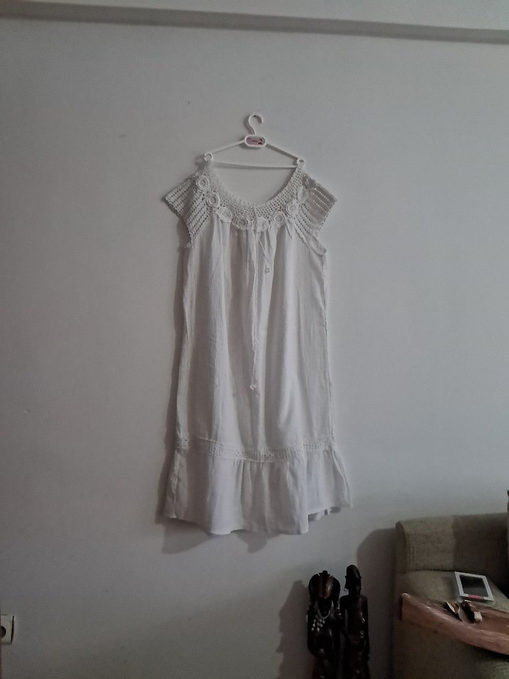 Kolsuz beyaz keten midi elbise, tekne yakalı ve fırfır detaylı. Rahat kesim, minimalist bohem tarzda, günlük kullanım için uygun.