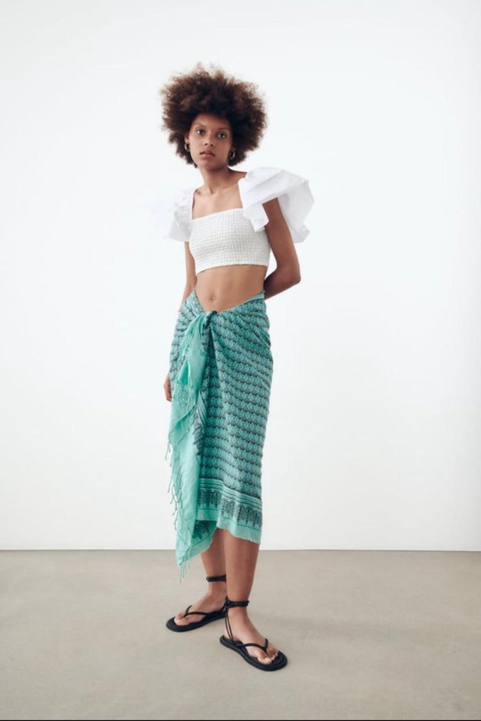 Beyaz, kolsuz ve bol kesim üst, bohem tarzıyla midi boyda bağlamalı tie-dye desenli pareo ile birleşiyor. Günlük kullanım için uygundur.