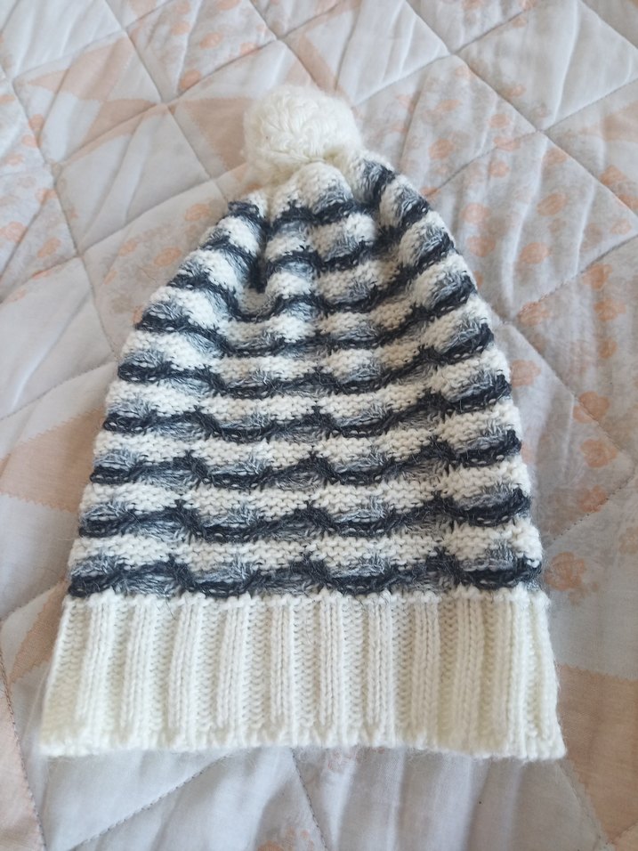 Kadınlar için beyaz ve gri örgülü desenli, üstünde ponponlu, bohem tarzda rahat ve sıcak tutan örgü bere.