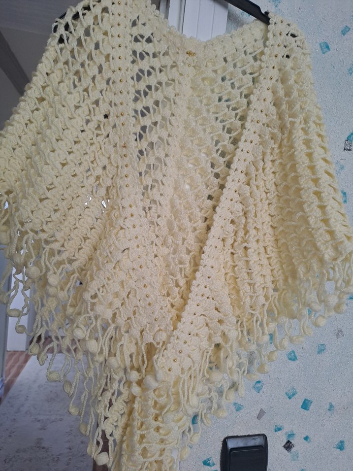Hafif beyaz, örgü dokulu kadın panço, rahat bohem tarzıyla gevşek ve açık örgü deseni ve püskül detayları içerir. Retro ve hippie stil için uygun.