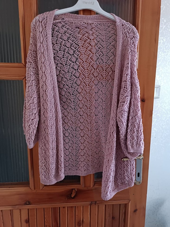 Uzun kollu, yuvarlak yaka, rahat kesim kadın hırka. Örgü deseniyle bohem tarzda, pastel bej renkte, günlük kullanıma uygun.
