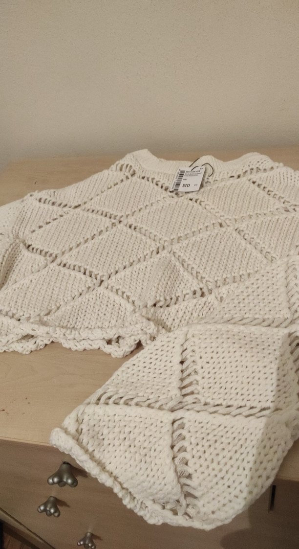 Kadınlar için bohem tarzda, gevşek kesim, yuvarlak yaka ve uzun kollu, kısa boy örgü beyaz kazak. Günlük kullanım için uygundur.