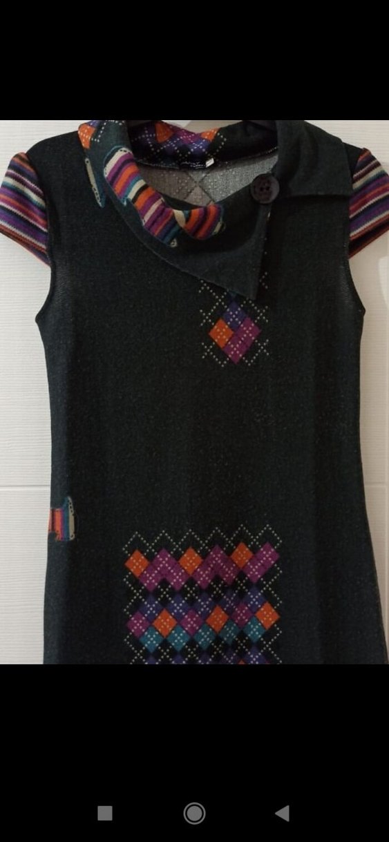 Kadınlar için bohem tarzda, örgü kumaştan yapılmış, tekne yaka ve kolsuz, kalıplı midi uzunlukta çok renkli desenli elbise.