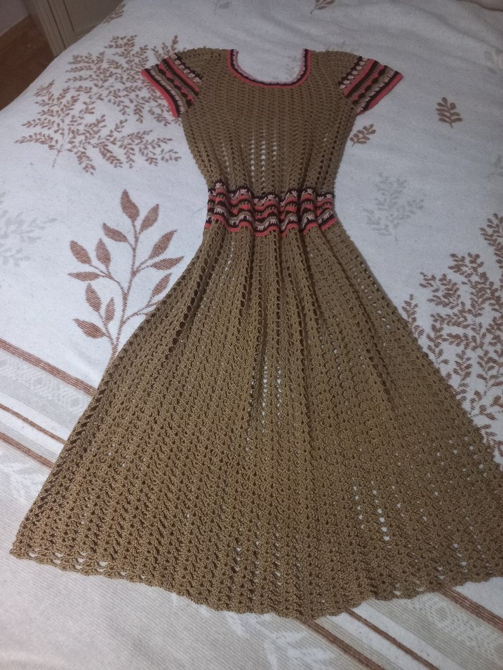 Bu kahverengi örgü uzun elbise, tekne yaka ve askılı kollarıyla günlük kullanıma uygun bohem tarz sunar.