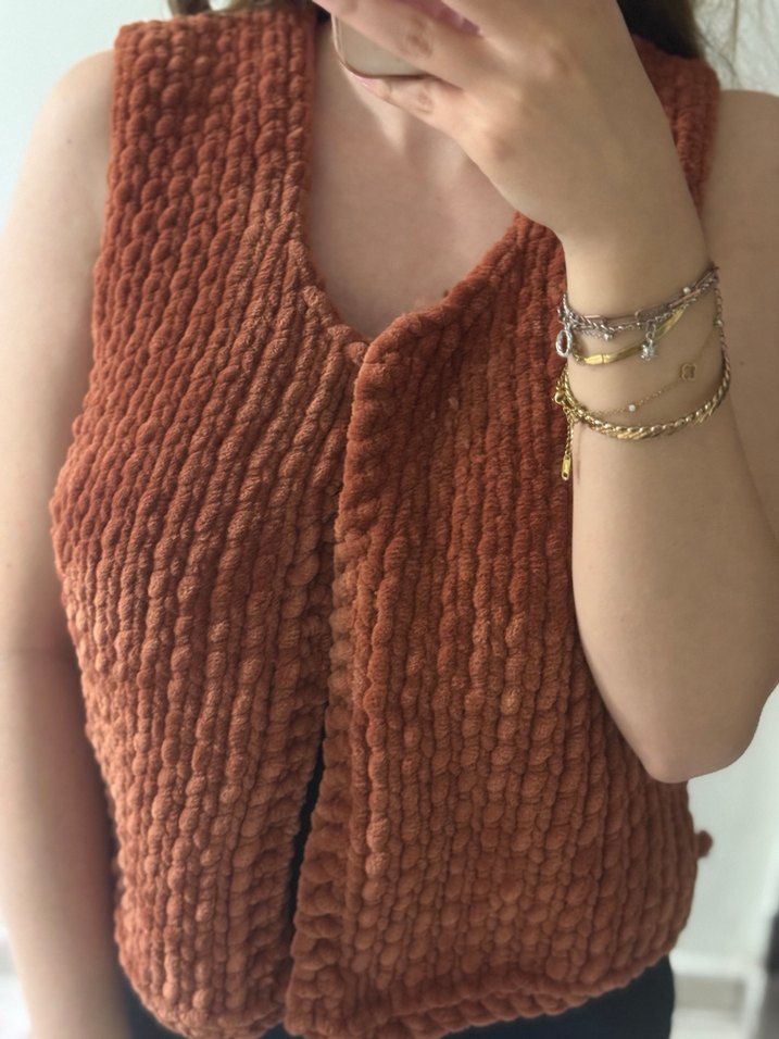 Kahverengi, yüksek yakalı, kolsuz ve bol kesim örgü yelek, rahat ve bohem stil sunar. Parlak dokusu günlük kullanım için uygundur.