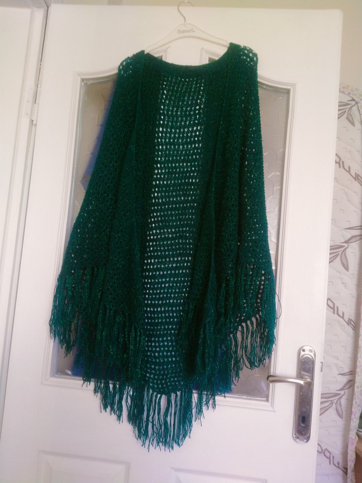 Koyu yeşil renkte, püsküllü ve dökümlü bohem tarzda örgü kadın panço. Retro ve hippie stilini yansıtır.