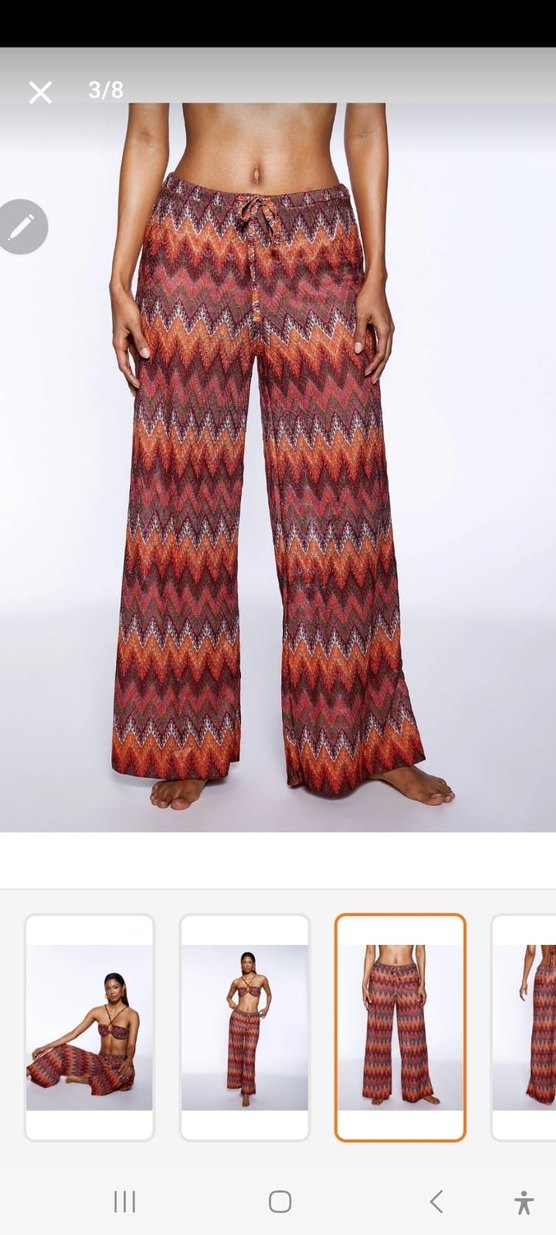 Kadınlar için bol kesim, uzun boy pilili pantolon. Koyu kahverengi batik desenli ve sentetik kumaştan üretilmiştir. Günlük kullanıma uygundur.