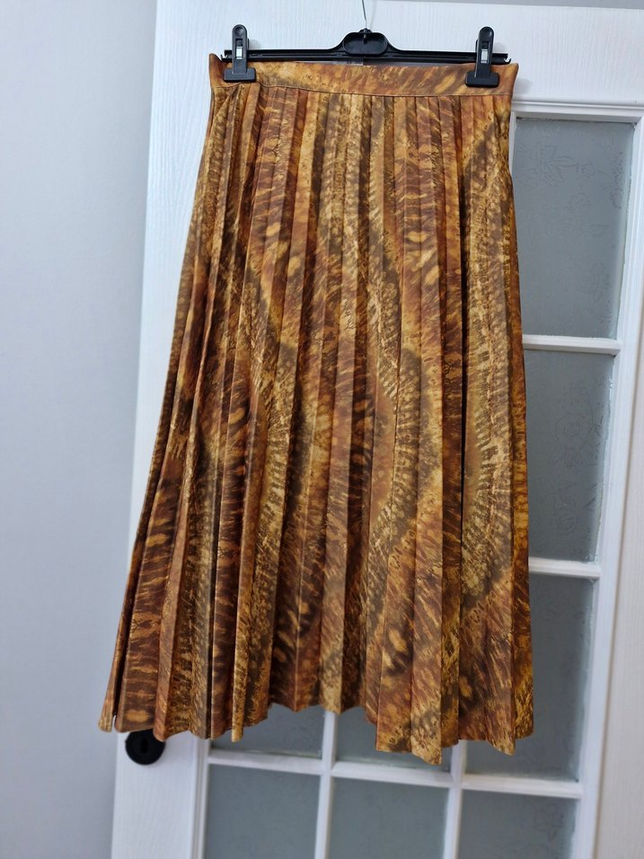 Kadınlar için pilili, parlak kahverengi batik desenli uzun etek. Sentetik kumaştan, bol kesim ve bohem tarzıyla dış mekan kullanımı için uygundur.