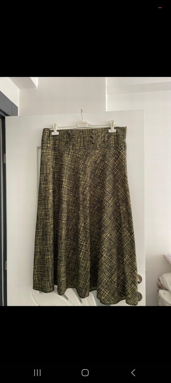Kahverengi uzun etek, pilili tasarımı ve batik deseniyle vintage bohem tarzında, bol kesimdir. Sentetik kumaştan yapılmıştır, günlük kullanım için uygundur.