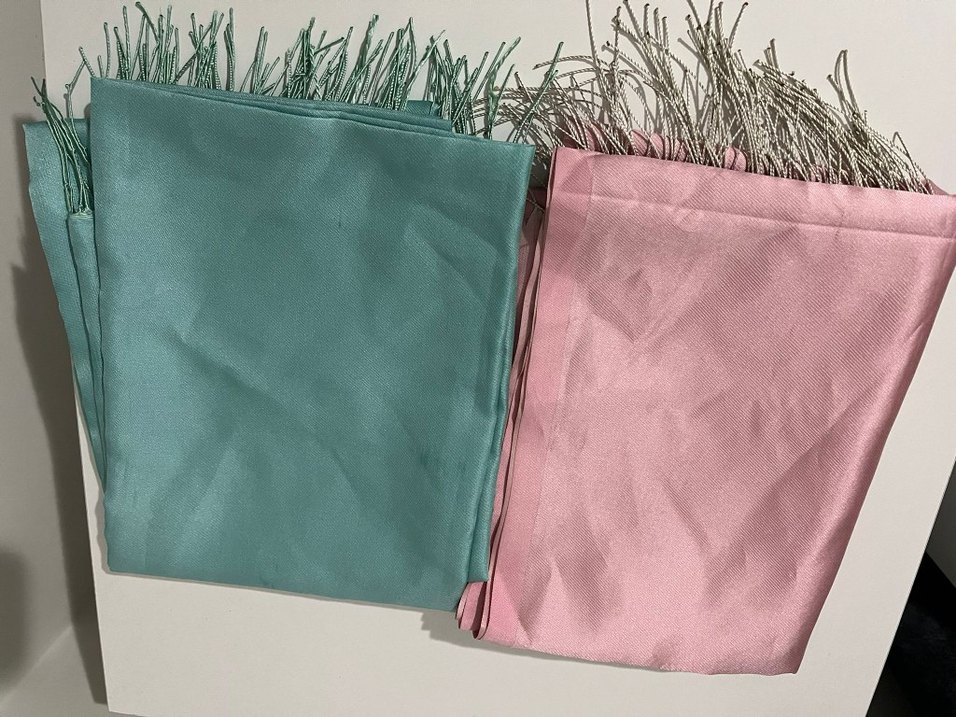 Yumuşak sentetik kumaştan yapılmış, pastel pembe ve yeşil renklerde, püskül detaylı kadın şalları. Bohem tarzında sade ve şık bir görünüm sunar.