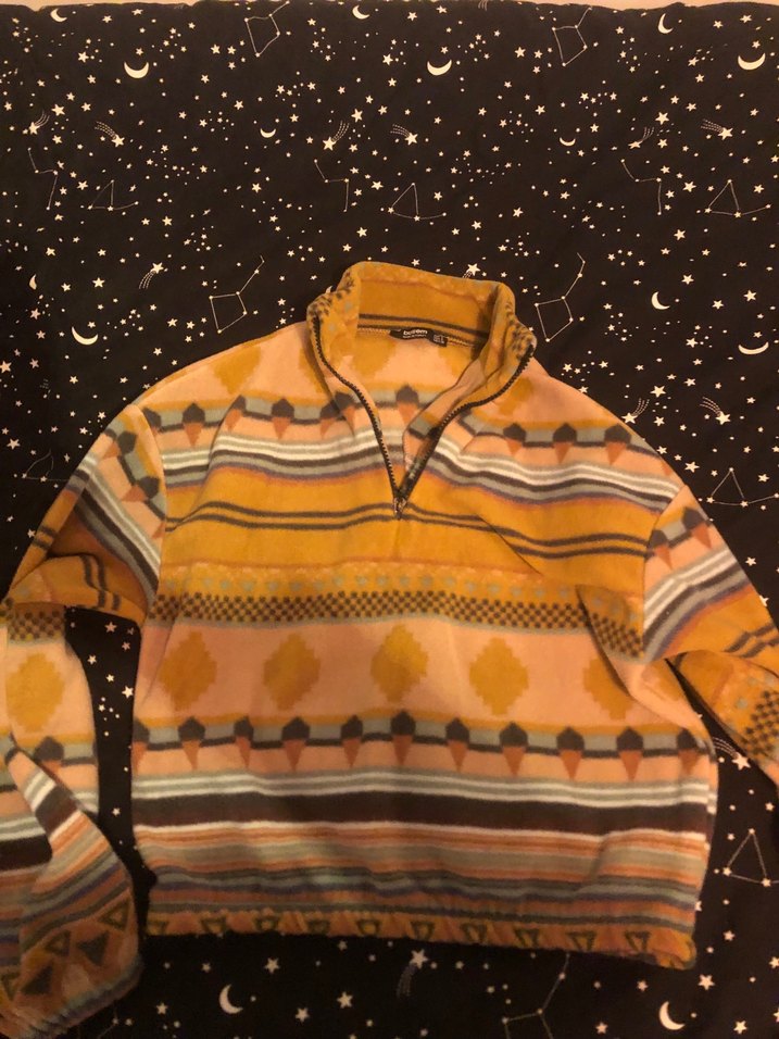 Yüksek yakalı, uzun kollu ve salaş kesim kadın triko sweatshirt. Örgü dokusu ve pastel tonlarda renkli çizgili desenlere sahip, bohem ve retro tarzı bir parça. Rahat günlük kullanım için uygun.