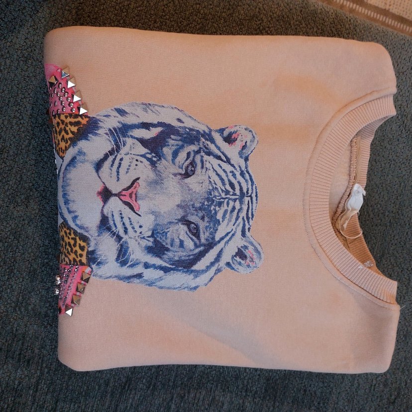 Camel renginde, bohem stiline uygun, baskılı kaplan figürlü ve kürk detaylı, uzun kollu, bol kesim kadın sweatshirtü.