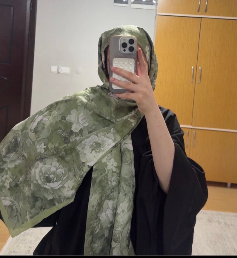 Kadınlar için haki renkte, çiçek desenli ve drapeli tasarıma sahip yumuşak sentetik kumaştan yapılmış bohem tarzı şal.