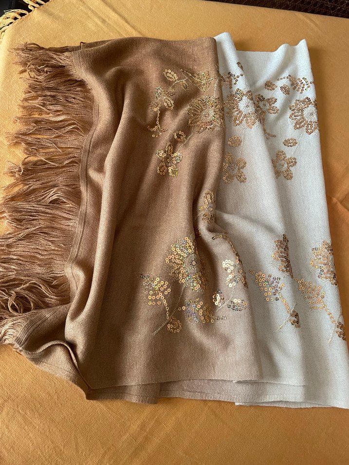 Hardal/sarı degrade renkli kadın şalı, triko yumuşak dokusu, drapeli tasarımı ve parlak oullu çiçek nakışlarıyla bohem ve rahat bir tarz sunar. Eni 60cm. Boyu 160 cm, şal/atkı kullanımına uygun. Yepyeni..✨