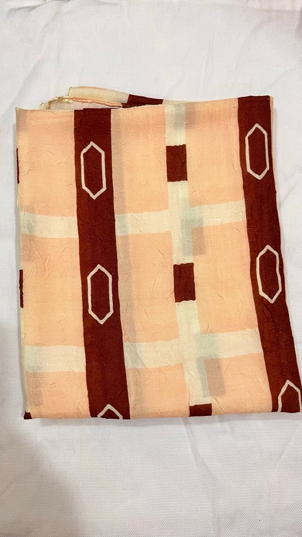 Hafif kahverengi, geometrik desenli, yumuşak sentetik kumaştan yapılmış kadın bohem tarzı şal. Drapeli tasarıma sahiptir.