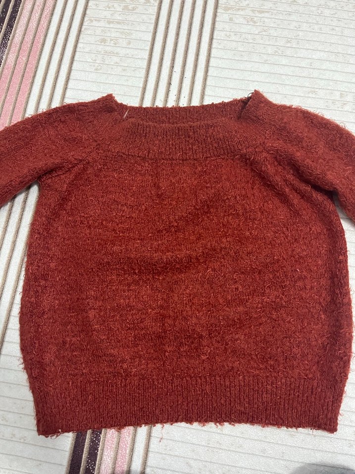 Kahverengi, parlak dokulu triko kazak, yuvarlak yaka ve uzun kolludur. Bol kesim ve midi boyuyla gündelik bohem tarz sunar.