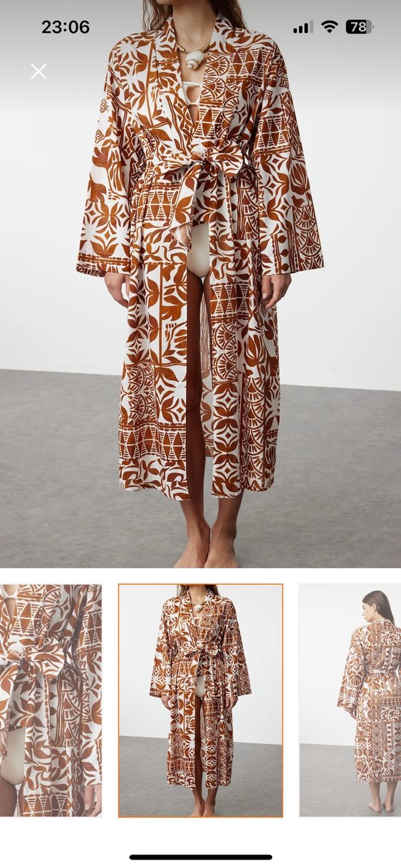 Kadınlar için bol kesim, uzun boy, kahverengi batik desenli kimono. Askılı kollar ve straplez yaka, yumuşak tekstil kumaştan, bohem tarz için uygun.