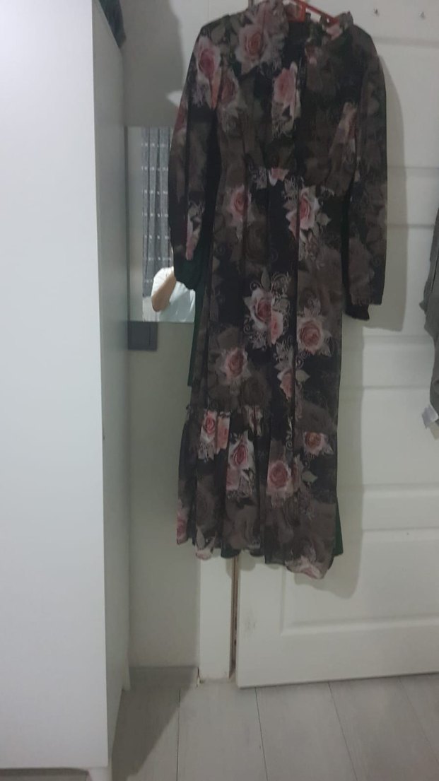 Bohem tarzda, uzun kollu ve yüksek yakalı kahverengi elbise. Sentetik kumaştan, bol kesim ve drapeli, çiçekli batik desenli.