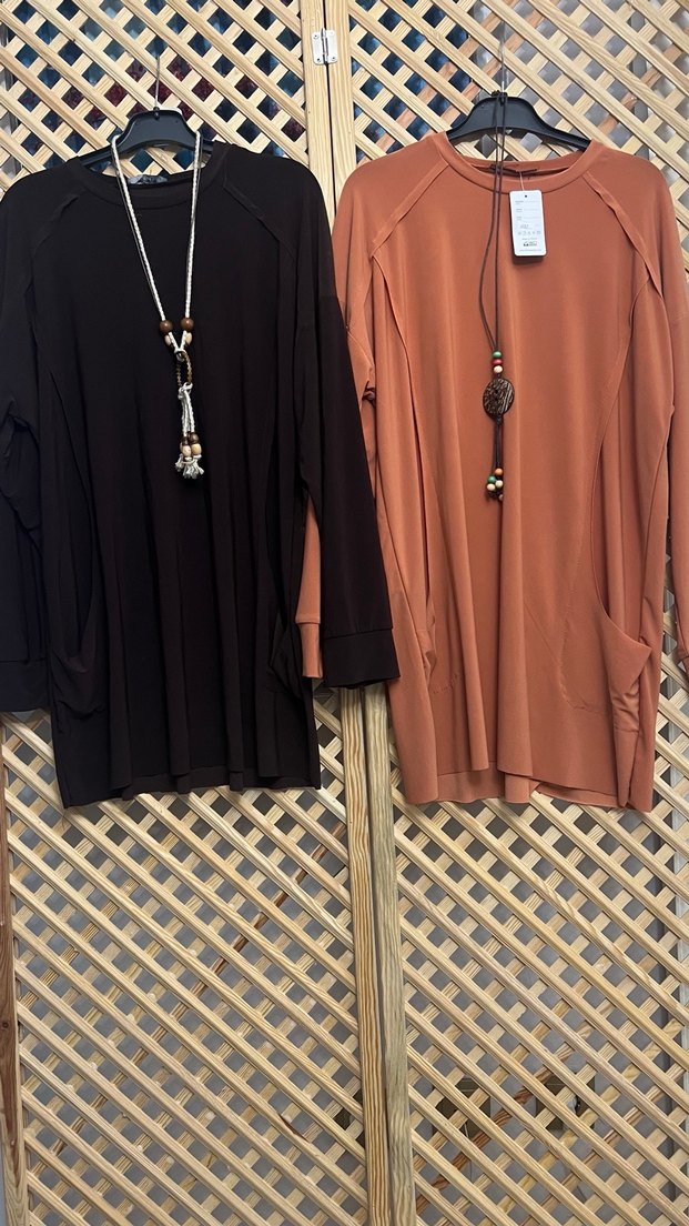 Koyu kahverengi, uzun kollu, bol kesim ve yuvarlak yakalı tunik. İpeksi kumaştan, günlük kullanım için bohem tarzda zahmetsiz şıklık sunar. 36/44 uyumlu 1 beden