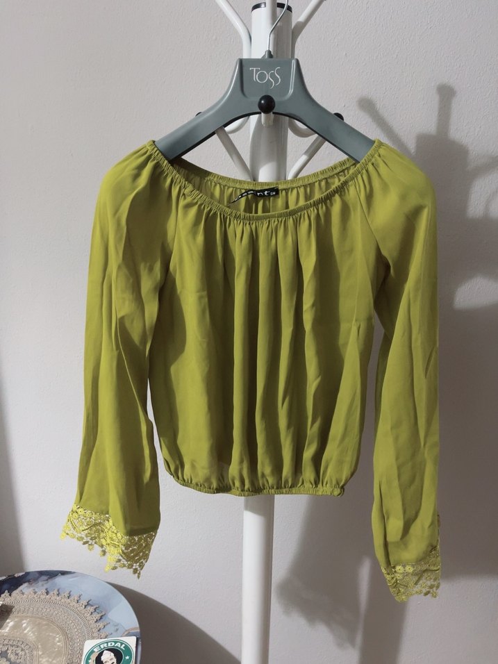 , bol kesim, straplez yaka ve uzun kollu khaki bluz. Pile detaylı ve manşetlerde dantel süslemelidir. Günlük kullanıma uygundur.