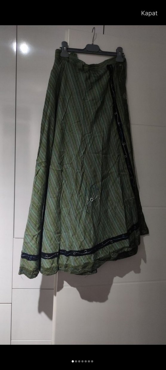 Kadınlar için uzun, dökümlü, bol kesim yeşil bağlama desenli sentetik kumaştan bohem tarzda etek. Günlük kullanım için uygundur.