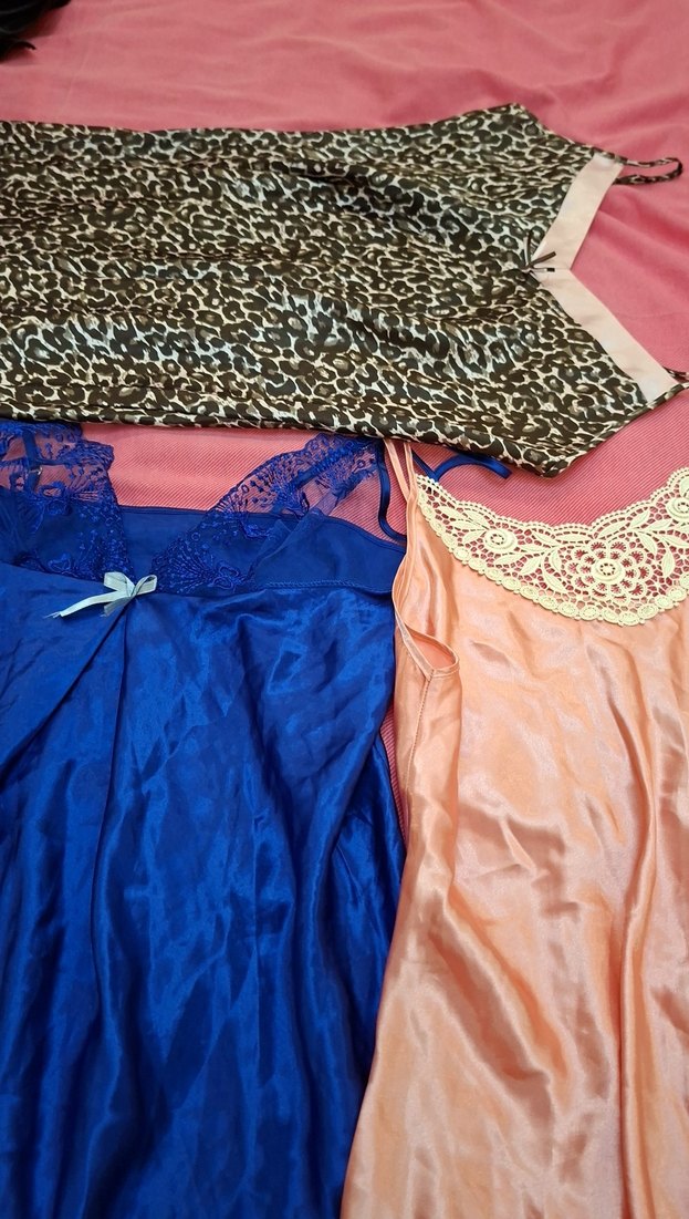 Kadınlar için ince askılı, midi boy ve vücuda oturan gecelikler. Koyu renkli, çok renkli bohem vintage tarzda ve narin dantel detaylıdır. 3 parça tek fiyata