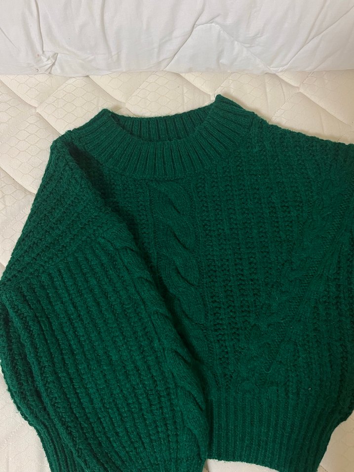 Koyu yeşil renkli, örgü kumaştan yapılmış, bohem tarzda, yuvarlak yaka ve uzun kollu, bol kesim bir kazak. İade süresi geçtiği için satıyorum