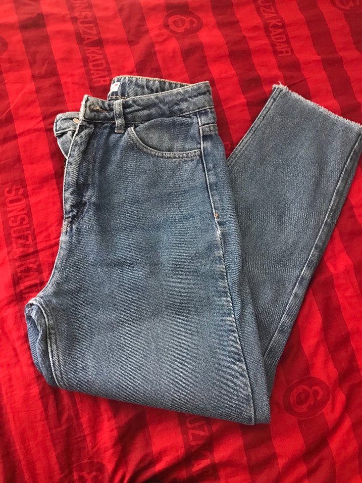 Mavi renkli, bol kesim kadın denim pantolon. Normal boyda, sokak stiline uygun ve günlük kullanıma elverişli.