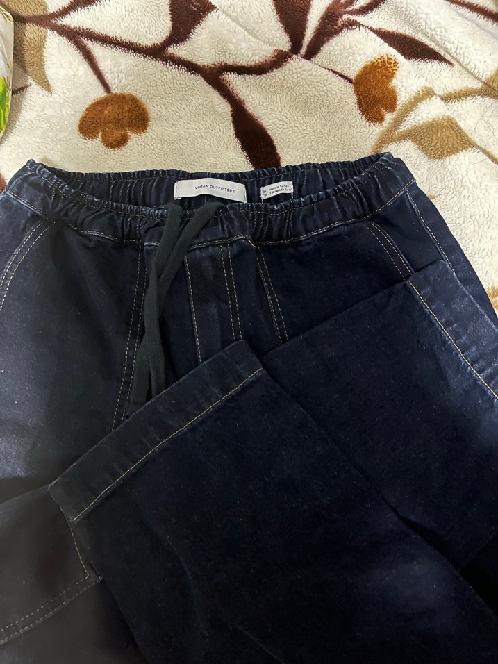 Kadınlar için bol kesim, elastik bel bantlı koyu kahverengi kot pantolon. Midi boy uzunluğunda, günlük kullanıma uygun rahat bir sokak stili sunar.
