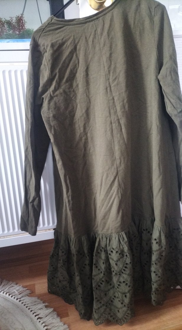 Uzun ve bol kesim tunik, uzun kollu ve yuvarlak yakalı, yumuşak keten kumaştan üretilmiş, etek kısmında fırfır detayları bulunuyor. Keten kumaş ve haki rengi ile günlük bohem tarzına uygun.