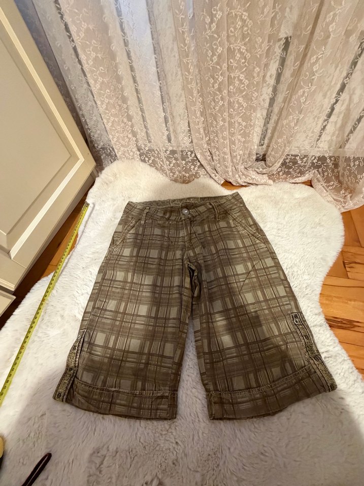 Kahverengi ve gri tonlarda kareli, pamuk kumaştan yapılmış bol kesim pantolon. Tokalı detaylara sahiptir, rahat ve şık bir görünüm sunar.