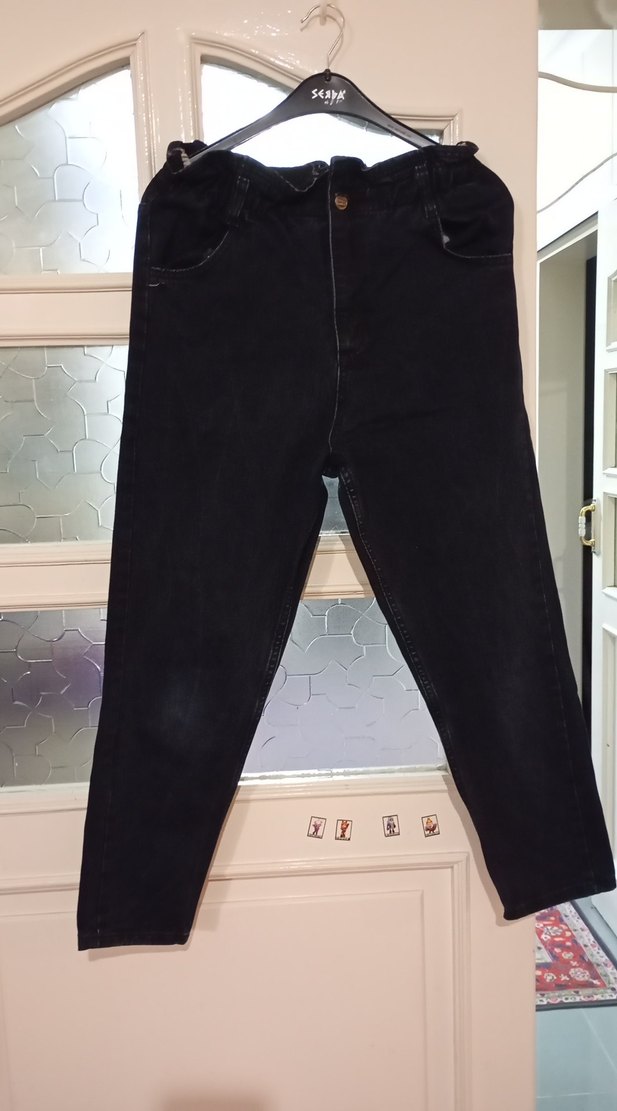 Kadınlar için denim bol kesim kot pantolon. Bel lastikli desensiz ve günlük kullanıma uygun sokak tarzı.