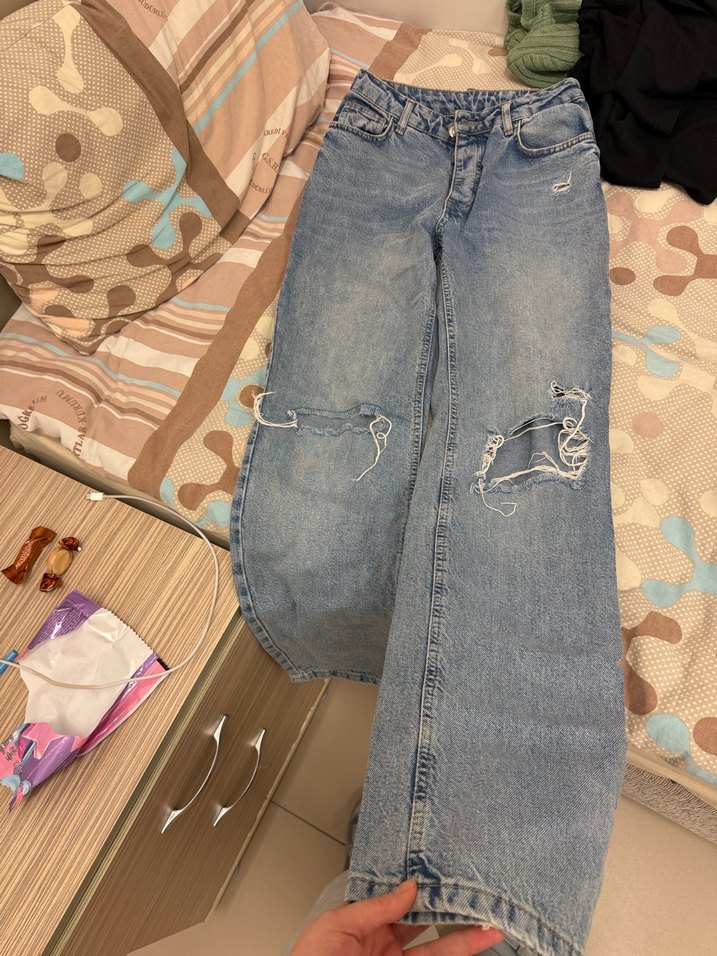Kadınlar için bol kesim, midi boy, yırtık detaylı denim kot pantolon. Günlük sokak stili için uygun.
