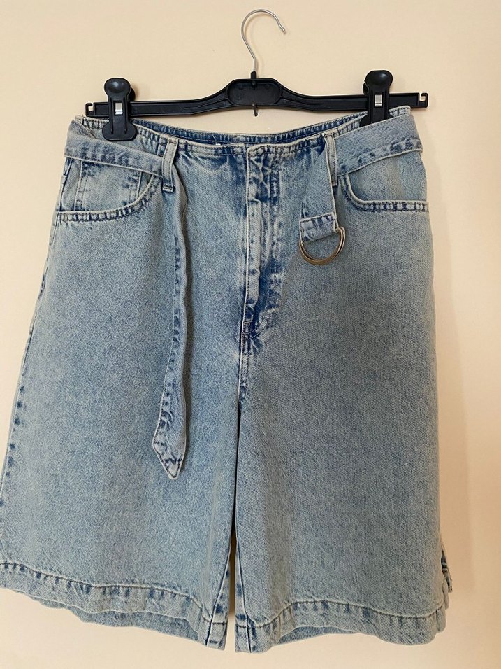 Kadınlar için kemerli, bol kesim, kısa boy kot şort. Gri-mavi tonlarda, desen içermeyen rahat ve günlük sokak stili için uygun.