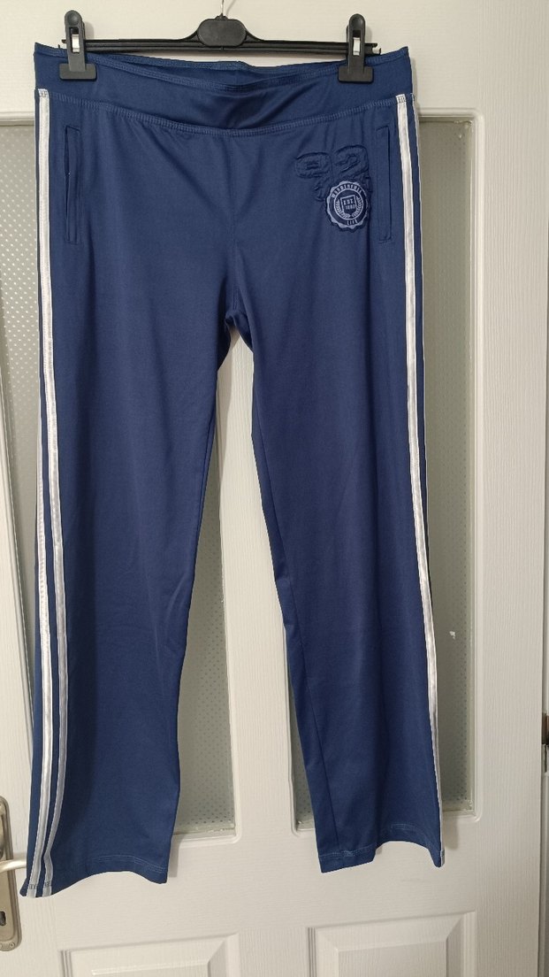 Mavi, bol kesim spor pantolon, kemerli ve yan şerit detaylı, rahat denim görünümlü kumaştan üretilmiştir. ♀️boy 103 bel 47 cm