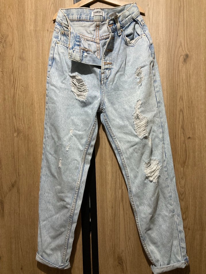 Kadınlar için bol kesim, yırtık detaylı ve kemerli bel kısmına sahip denim jean pantolon. Günlük sokak stiline uygun, açık bgri tonlarında midi boy jean.