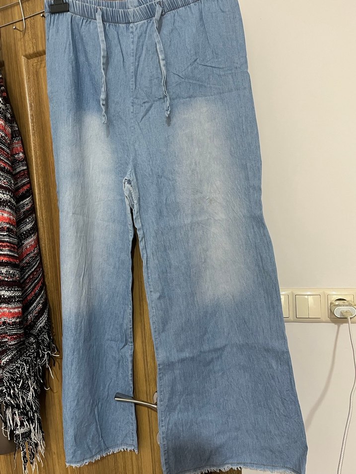 Kadın kot pantolon, beli lastikli, ince yazlık. Çatı kısmı biraz sökülmüş