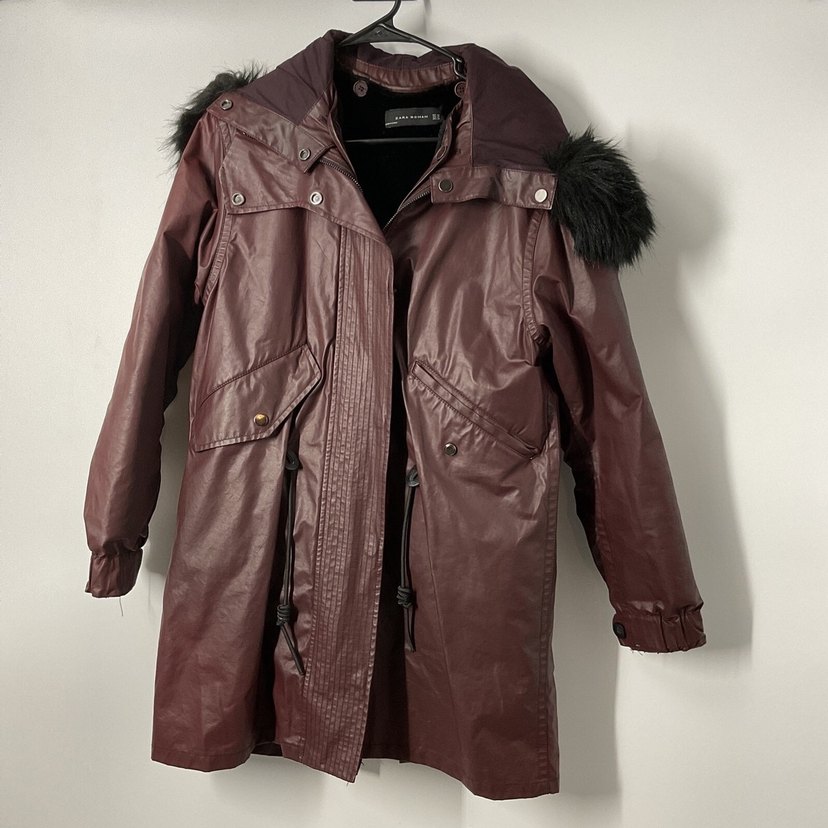 Kadınlar için bordo deri ceket, kürklü kapüşon ve kesimli yaka ile. Normal kesim, uzun kollu ve midi boyda, sokak tarzına uygun. İçindeki kürk çıkabilir