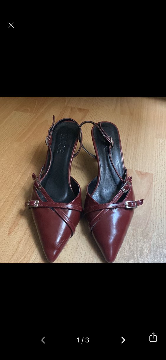 Bordo deri stiletto, tokalı kayışları ve sivri burunlarıyla romantik akşamlar için klasik ve şık bir seçim. Koyu tonlarda. Orijinaldir 38-39 num uygun 5 cm orijinaldir.