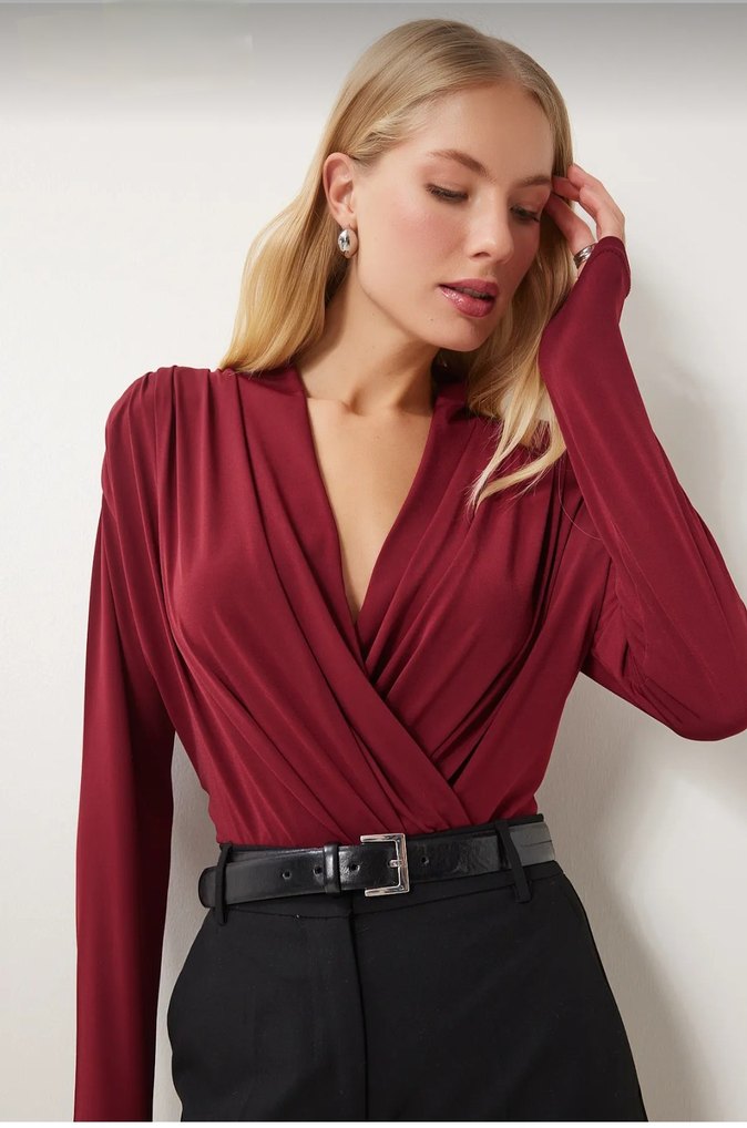 Kadınlar için V yaka ve uzun kollu, drapeli tasarıma sahip bordo renkli bluz. İpek gibi kumaştan, regular fit ve kısa boyda, ofis için uygun.