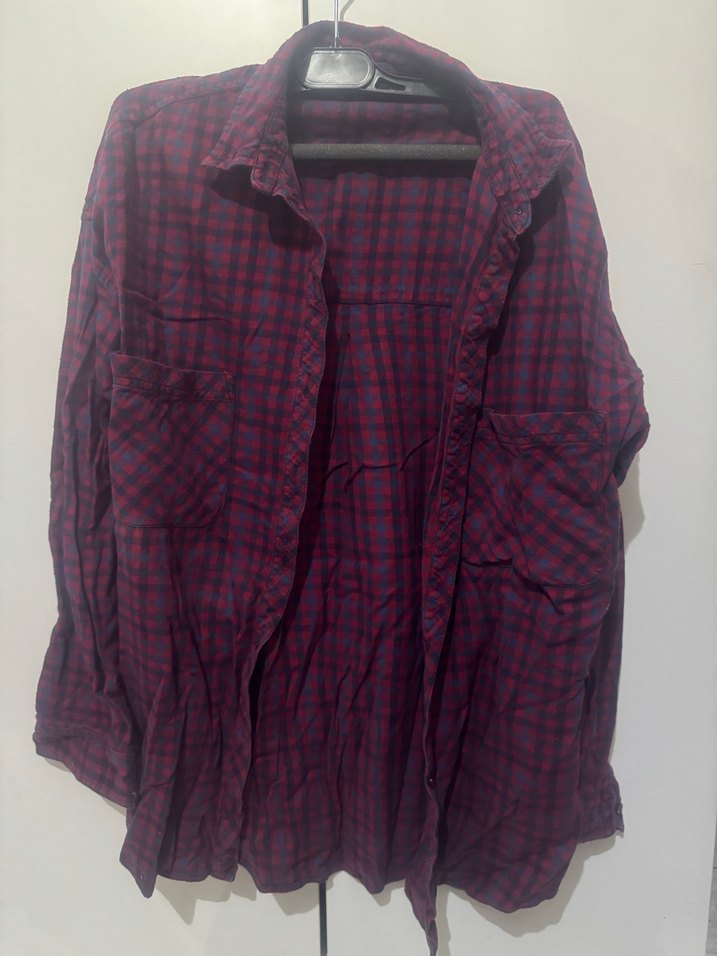 Bordo renkte, düğmeli, uzun kollu ve yakalı kadın gömleği. Rahat kesimi ve tekstil kumaşıyla günlük kullanıma uygun casual stil.