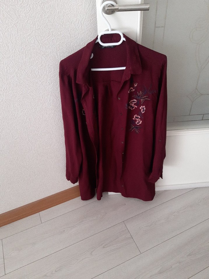 Kadınlar için bordonun koyu tonunda, coton kumaştan, uzun kollu, düğmeli ve yakası kesik detaylı normal kesim gömlek.iki önü nakışlı, günlük kullanıma uygun.